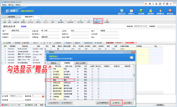 配置完成后,用戶在開具銷售出庫單時,便可在“贈品”列中勾選相應商品,其金額將自動變為0,確保應收金額的準確性。例如,當選擇“松下熱敏傳真機”作為贈品時,只需簡單勾選,該商品便不再計入應收金額。