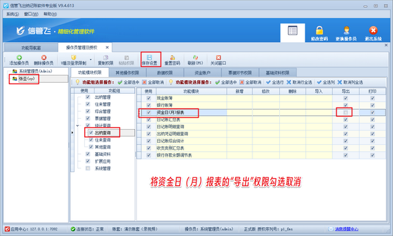 登錄軟件,在功能導(dǎo)航窗點(diǎn)擊“系統(tǒng)管理”—》“操作員及授權(quán)”,進(jìn)入“操作員管理及授權(quán)”界面,選擇操作員賬號(hào)“張亞”,在其右側(cè)的功能模塊權(quán)限內(nèi)選擇“出納查詢(xún)”,將資金日(月)報(bào)表的“導(dǎo)出”權(quán)限勾選取消,然后保存權(quán)限設(shè)置,如下圖所示。