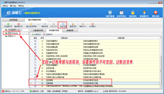 配置過程簡潔直觀:管理員進入【系統管理】模塊,通過【操作員及授權】界面即可完成權限分配。以操作員“張亞”為例,僅需取消勾選“簽回單據”與“過賬單據”權限,保存后系統立即生效。