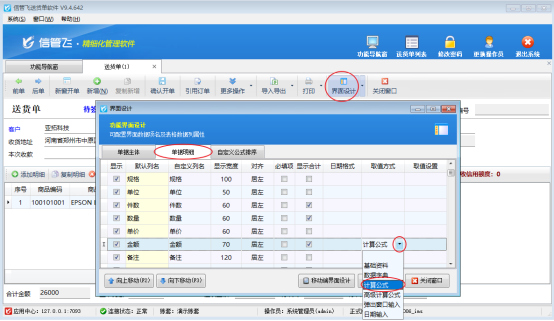 在界面設計窗口中,用戶需找到默認列名件數、數量、單價,并設置“金額”的計算公式為三者的乘積。由于系統默認金額計算公式為單價乘以數量,需額外配置金額計算公式:{件數} *{數量}* {單價},如圖。