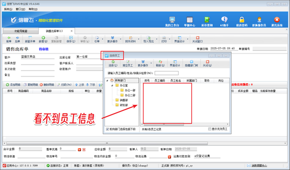 出現(xiàn)以上問題的原因是:當前登錄的操作員賬號沒有查看部門員工的權限。