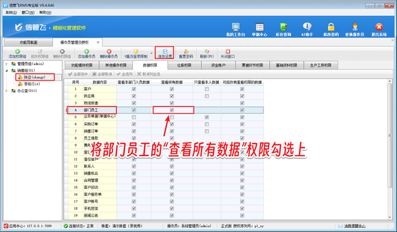 解決方法如下:使用系統(tǒng)管理員賬號登錄軟件,在功能導航窗點擊“系統(tǒng)管理”—》“操作員及授權”打開操作員管理及授權界面,選擇操作員賬號,在“數(shù)據(jù)權限”界面將部門員工“查看所有數(shù)據(jù)”的權限勾選上,然后保存權限設置,如下圖所示。