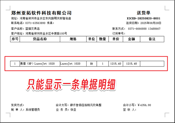 最近有信管飛軟件用戶咨詢,在軟件內(nèi)自定義設(shè)計(jì)的銷售單打印格式模版,打印預(yù)覽只能顯示一條單據(jù)明細(xì),如下圖所示。