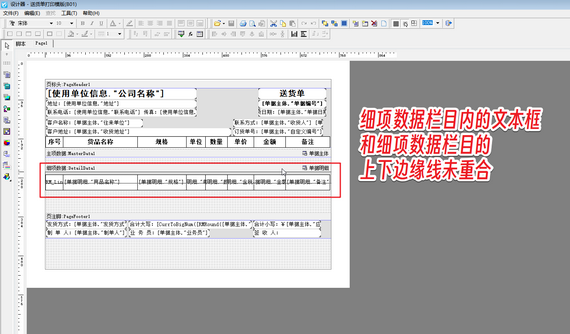 出現(xiàn)以上問(wèn)題的原因是:在設(shè)計(jì)模版時(shí),細(xì)項(xiàng)數(shù)據(jù)欄目?jī)?nèi)的文本框超出了細(xì)項(xiàng)數(shù)據(jù)欄目區(qū)域,文本框上下邊緣線和細(xì)項(xiàng)數(shù)據(jù)欄目的上下邊緣線未完全重合。