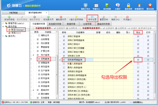 首先使用系統(tǒng)管理員賬號(hào)登錄軟件,在功能導(dǎo)航窗中,點(diǎn)擊“系統(tǒng)管理”—》“操作員及授權(quán)”,進(jìn)入“操作員管理及授權(quán)”界面,在操作員列表中,選擇需要設(shè)置權(quán)限的操作員,例如“張亞”,在其右側(cè)的功能模塊權(quán)限內(nèi),找到“采購(gòu)查詢(xún)”模塊,將采購(gòu)單明細(xì)查詢(xún)的“導(dǎo)出”權(quán)限勾選,然后點(diǎn)擊保存按鈕保存。