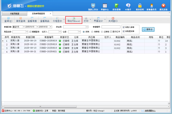 權(quán)限設(shè)置完成后,切換操作員“張亞”登錄軟件。打開(kāi)“采購(gòu)管理”—》“采購(gòu)單明細(xì)查詢(xún)”界面,此時(shí)即可正常導(dǎo)出采購(gòu)單明細(xì)。