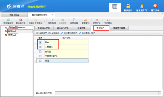 在“系統管理”→“操作員及授權”中,選擇對應操作員(如“張亞”),進入“資金賬戶權限”設置界面,勾選其可訪問的賬戶,屏蔽無關賬戶。