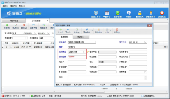 再回到應付款管理界面,未結銷的采購預付款的結銷狀態更新為部分結銷,并且未結銷金額是-50000元,該筆采購預付款可用于后續采購應付款金額進行抵消結算。