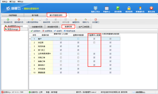 除了客戶資料的權限管理,信管飛RMS軟件還支持操作員只能查看自己開具的單據。在“系統管理”模塊下,選擇“操作員及授權”,為業務員“張亞”設置權限,使其僅能查看自己開具的銷售出庫單,同時剝奪其查看其他業務員單據的權限。