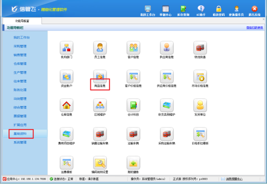 登錄軟件,在功能導(dǎo)航窗中點(diǎn)擊“基礎(chǔ)資料”-》“商品信息”,進(jìn)入“商品信息”界面,這里匯聚了企業(yè)所有商品的相關(guān)信息,是進(jìn)行貨位設(shè)置操作的起點(diǎn)。