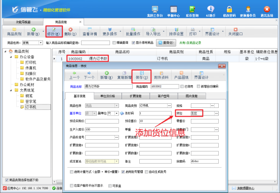 在“商品信息”界面中,您會(huì)看到一系列商品列表。找到您想要設(shè)置貨位的商品,選中該商品后,點(diǎn)擊界面上的“修改”按鈕。此時(shí),系統(tǒng)會(huì)彈出商品信息修改窗口,在這個(gè)窗口中,您可以找到專門用于錄入貨位信息的字段。將商品實(shí)際存儲(chǔ)的貨位準(zhǔn)確錄入后,點(diǎn)擊“保存”按鈕,該商品的貨位信息就設(shè)置成功了。
