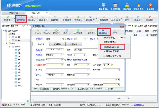 選擇憑證:找到需結算的憑證,點擊「修改憑證」→「更多操作」→「核銷應收應付款」;