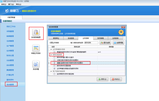 信管飛RMS是進銷存一體化的軟件,支持開單上傳附件資料和開銷售出庫單可打印附件資料圖片,如果附件資料里面有多張圖片,那么如何一次性把附件資料的所有圖片都打印出來呢,本文以“信管飛RMS專業版”示范下如何設置?     在功能導航窗點擊“系統管理”—》“系統參數”,選擇“業務參數”“特殊功能參數”中的“銷售出庫