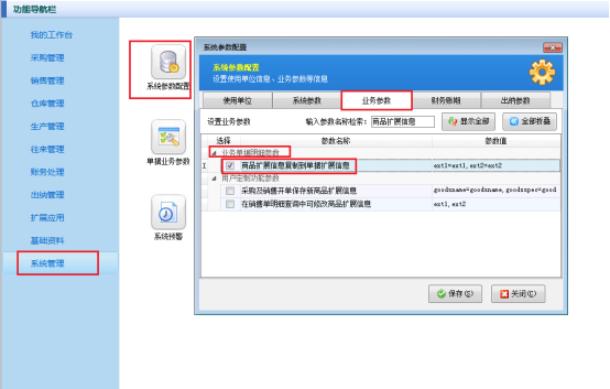演示視頻觀看鏈接:如何設(shè)置商品擴(kuò)展信息復(fù)制到單據(jù)擴(kuò)展信息演示視頻 信管飛RMS軟件、信管飛倉庫管理軟件、信管飛送貨單軟件都支持設(shè)置商品的擴(kuò)展信息提取到單據(jù)的擴(kuò)展信息,啟用此參數(shù)后,在開單據(jù)時(shí)系統(tǒng)會(huì)自動(dòng)調(diào)取商品信息中擴(kuò)展信息的數(shù)據(jù),省去了每次開單錄入單據(jù)擴(kuò)展信息的時(shí)間,提高了開單效率。下面我們以信管飛R