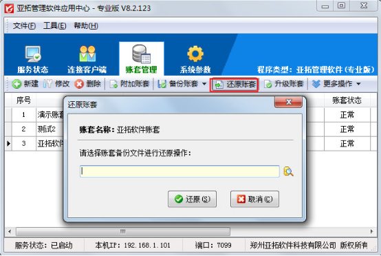 亞拓管理軟件、亞拓倉庫管理軟件中都含有賬套管理功能,賬套管理實(shí)現(xiàn)賬套數(shù)據(jù)庫的集中管理,包括新建賬套、修改賬套屬性、刪除賬套、附加賬套、備份賬套、還原賬套和升級賬套等功能。下面我們以亞拓管理軟件為例來演示一下賬套管理中各個(gè)功能具體的操作方法。    打開亞拓管理軟件應(yīng)用中心(桌面右下角紅色的圖標(biāo))—》“賬套管理”即可進(jìn)入賬套管理界面