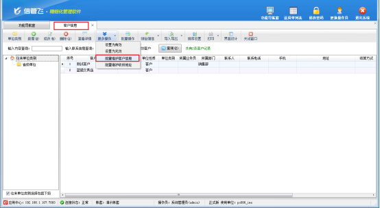 此文章相關(guān)演示視頻:送貨單軟件如何批量設(shè)置客戶(hù)所屬部門(mén)演示視頻 信管飛RMS、信管飛倉(cāng)庫(kù)管理軟件、信管飛送貨單軟件等都支持批量維護(hù)客戶(hù)信息,可批量維護(hù)客戶(hù)信息的名稱(chēng)、聯(lián)系人、電話(huà)、地址等信息。同時(shí)也支持批量維護(hù)客戶(hù)所屬部門(mén),本篇文章以送貨單軟件為例介紹