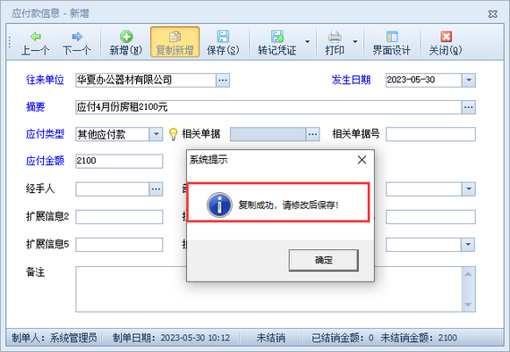 演示視頻觀看鏈接:出納記賬軟件如何復(fù)制新增應(yīng)付款演示視頻 信管飛出納記賬軟件應(yīng)付款管理功能可以對(duì)采購(gòu)應(yīng)付款、采購(gòu)預(yù)付款、采購(gòu)?fù)素洃?yīng)退款、期初應(yīng)付款、其他應(yīng)付款(如房租)等各類(lèi)應(yīng)付款項(xiàng)進(jìn)行集中管理。其中房租一般是固定的,每個(gè)月都一樣,系統(tǒng)支持復(fù)制上個(gè)月的應(yīng)付款房租數(shù)據(jù)生成新的應(yīng)付款,本篇文章介紹一下操作方法。 &nb