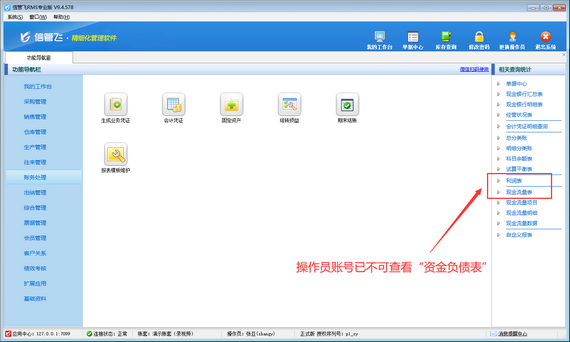 演示視頻觀看鏈接:信管飛RMS如何設置操作員不可查看資產負債表演示視頻 財務報表是財務報告的主要部分,是反映企業或預算單位一定時期資金、利潤狀況的會計報表。信管飛RMS專業版支持財務處理功能,可登記會計憑證,并支持生成財務報表,如資產負債表、利潤表、現金流量表等,如下圖所示。如果不希望員工賬號登錄后查看到這些報表,如何設置呢?本篇文章演