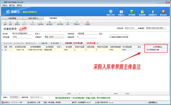 信管飛RMS支持管理往來應收應付款,支持對應收應付款進行收付款結算操作,方便用戶查看收付款情況。有用戶在對應收應付款進行收付款結算時,需要在收付款結算單界面顯示采購入庫單(銷售出庫單)的備注信息,本篇文章以設置付款結算單界面顯示采購入庫單單據(jù)備注為例介紹一下操作方法。 演示視頻觀看鏈接:收付款結算單如何顯示業(yè)務單據(jù)備注演示視