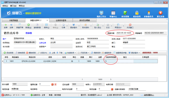 用戶在使用進(jìn)銷存軟件過程中,遇到在銷售出庫單界面點擊刷新庫存按鈕,當(dāng)前庫存數(shù)量未更新為該商品的當(dāng)前實際庫存數(shù)量,是什么原因呢,該如何解決? 例如商品名稱“EPSON LQ-630K”,倉庫庫存數(shù)量是5個,出庫單開單界面點擊刷新庫存當(dāng)前庫存數(shù)量是0,經(jīng)檢查發(fā)現(xiàn)原因是該商品入庫單發(fā)生時間是5月30日14點