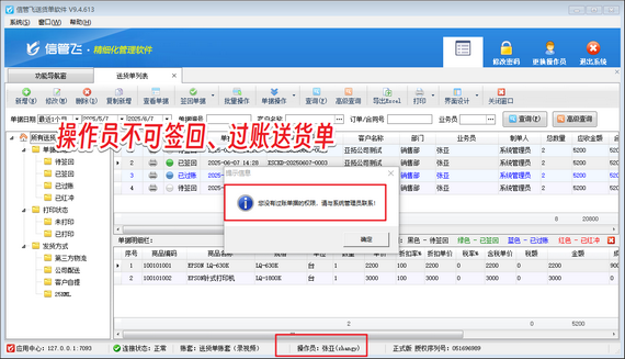 在商貿(mào)流通領(lǐng)域,送貨單作為貨物交接的核心憑證,其簽收與回執(zhí)流程直接影響企業(yè)資金流轉(zhuǎn)效率與風(fēng)險管控能力。信管飛送貨單軟件以智能化流程管理為核心,通過“待簽回-已簽回-已結(jié)賬”三階狀態(tài)控制,實現(xiàn)貨物交付全鏈路可視化追蹤,更以精細(xì)化權(quán)限管理功能,為企業(yè)筑牢運(yùn)營安全防線。 針對多角色協(xié)作場景,信管飛送貨單軟件創(chuàng)新推出操作權(quán)限分級機(jī)制