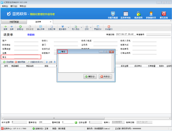 紅管家送貨單軟件、紅管家倉庫管理軟件和亞拓管理軟件單據(jù)中的擴展信息及備注等都可設(shè)置取值方式,都可以通過彈出窗口輸入的方式進行錄入信息。當(dāng)錄入的備注或者擴展信息文本內(nèi)容比較多時,由于界面有限,直接錄入窗口無法顯示全部的錄入信息,我們可以設(shè)置該數(shù)據(jù)項的取值方式為“彈出窗口輸入”,方便錄入更多的數(shù)據(jù)內(nèi)容。 我們以送貨單軟件為例,示