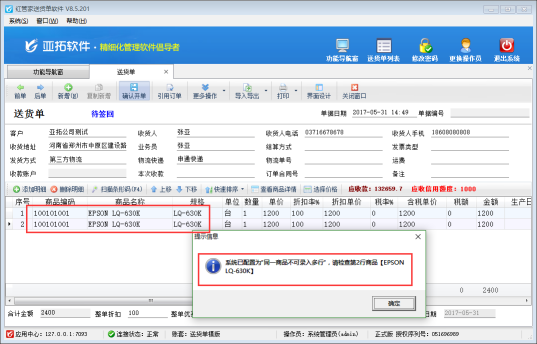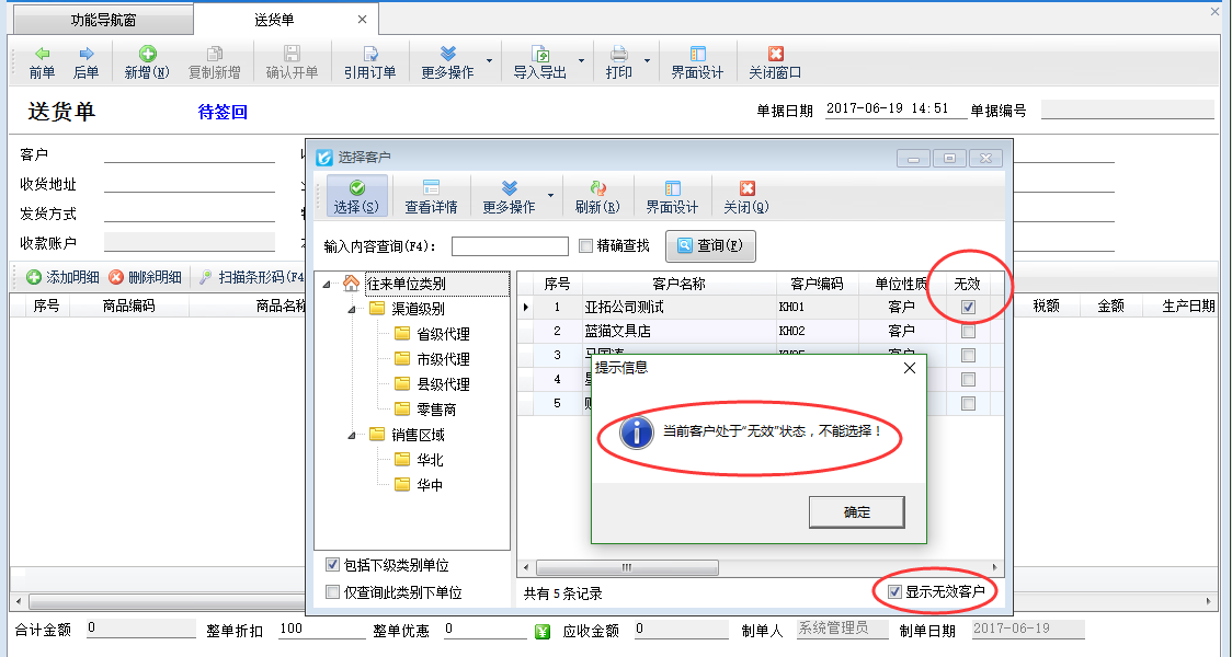 紅管家送貨單打印軟件是一款針對中小型企業(yè)開發(fā)的集送貨管理(發(fā)貨管理)、退貨管理(銷售退貨)、銷售收款(應收款管理)等功能為一體的送貨管理及打印軟件(送貨單打印軟件、發(fā)貨單打印軟件、出貨單打印軟件、收據打印軟件、貨單票據打印軟件)。 經常會有用戶問到刪除客戶資料時會彈出提示信息:“當前選擇的往來單位在單據中有使用,不能刪除”(