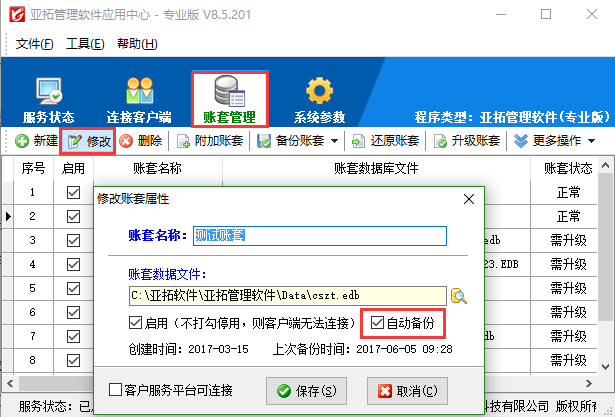 亞拓管理軟件、紅管家送貨單軟件、紅管家出納記賬軟件、紅管家倉庫管理軟件及紅管家票據軟件都支持設置賬套自動備份,我們強烈建議啟用自動備份功能,以便賬套出現(xiàn)問題的時候從賬套備份文件中恢復數(shù)據。本節(jié)我們以亞拓管理軟件為例詳細介紹一下如何啟用賬套自動備份功能? 首先打開軟件應用中心主界面,點擊“系統(tǒng)參數(shù)”—“賬套備份參數(shù)”可以打開賬