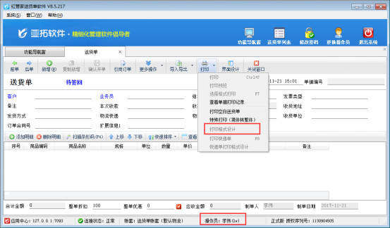 亞拓軟件自主研發的亞拓管理軟件、紅管家送貨單軟件、紅管家票據打印軟件、紅管家倉庫管理軟件都支持自定義設計打印模板,打印模板設計完成后,為了避免操作員修改錯打印模板,軟件可以設置操作員的打印模板設計權限。(系統管理員默認具有所有權限,不允許修改)。     以送貨單軟件為例,示范下如何控制操作員的打印模板設計權