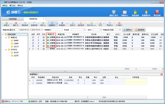 信管飛倉庫管理軟件、信管飛RMS軟件新增采購單都可以直接保存并審核單據(jù),軟件還支持批量審核采購單。如果您每天錄單量較多,為了節(jié)省時間提高工作效率,可以使用批量審核功能,下邊我們在信管飛倉庫管理軟件的采購單列表中示范下如何使用批量審核功能。 在功能導(dǎo)航窗點“采購管理”—》“采購單列表”即可進入“采購單列
