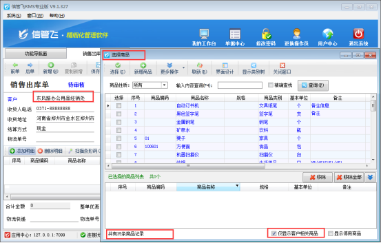 信管飛RMS軟件、信管飛倉庫管理軟件和信管飛送貨單軟件開單時都支持選擇系統內已錄入的商品信息,進行快速選擇商品來開單。選擇商品時在選擇商品窗口默認是可以顯示所有商品(圖1),但是部分用戶在選擇商品時只需要顯示此客戶相關的商品,如何設置呢?本篇文章我們以信管飛RMS 專業版軟件為例來詳細介紹一下如何設置在選擇商品窗口僅顯示客戶相關商品? 圖