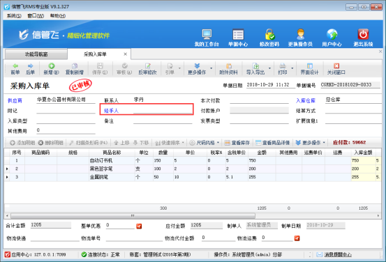 信管飛RMS軟件、信管飛倉庫管理軟件等默認開單的經手人或業務員不允許為空,如果您在開單時不需要錄入經手人或業務員,支持在軟件中進行設置。     以信管飛RMS軟件專業版為例,示范下如何設置開采購單經手人允許為空的方法。(銷售單的業務員允許為空操作步驟和此一致,不再贅述)