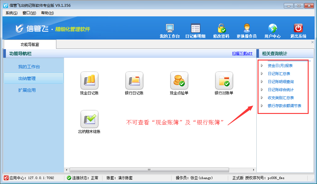 信管飛出納記賬軟件內(nèi)包含豐富的記賬統(tǒng)計表格,如現(xiàn)金賬簿、銀行賬簿、資金日(月)報表、收支類別匯總表等。如果不希望員工賬號登錄后查看到這些報表,如何設(shè)置呢?本篇文章以信管飛出納記賬軟件專業(yè)版為例演示一下出納記賬軟件內(nèi)如何設(shè)置操作員不可查看現(xiàn)金及銀行賬簿。 登錄軟件,在功能導(dǎo)航窗點擊“系統(tǒng)管理”—》“操作員及授權(quán)”,進入“操作員