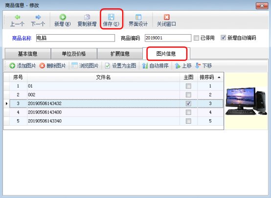 信管飛倉庫管理軟件、信管飛RMS(進銷存軟件)都可以對商品信息進行管理,都支持上傳商品圖片,以便用戶查看商品圖片信息。本篇文章以信管飛倉庫管理軟件為例介紹一下如何上傳商品圖片。    在功能導航窗點“基礎資料”—》“商品信息”即可進入“商品信息”界面,對商品進行新增或修改時可以編輯商品信息、上傳商品圖片信息。以商品“電腦”為例,對