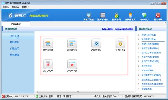 信管飛送貨單軟件是集送貨單、退貨單、訂單、銷售收款等功能為一體的送貨管理及打印軟件。     軟件界面默認顯示所有的功能模塊,主要包括新開送貨單、送貨單列表、應收款管理、新開收款單、收款單列表、新開退貨單、退貨單列表、新開訂單、訂單列表。軟件支持隱藏不需要的功能模塊,下邊我們在信管飛送貨單軟件中示范如何隱藏不