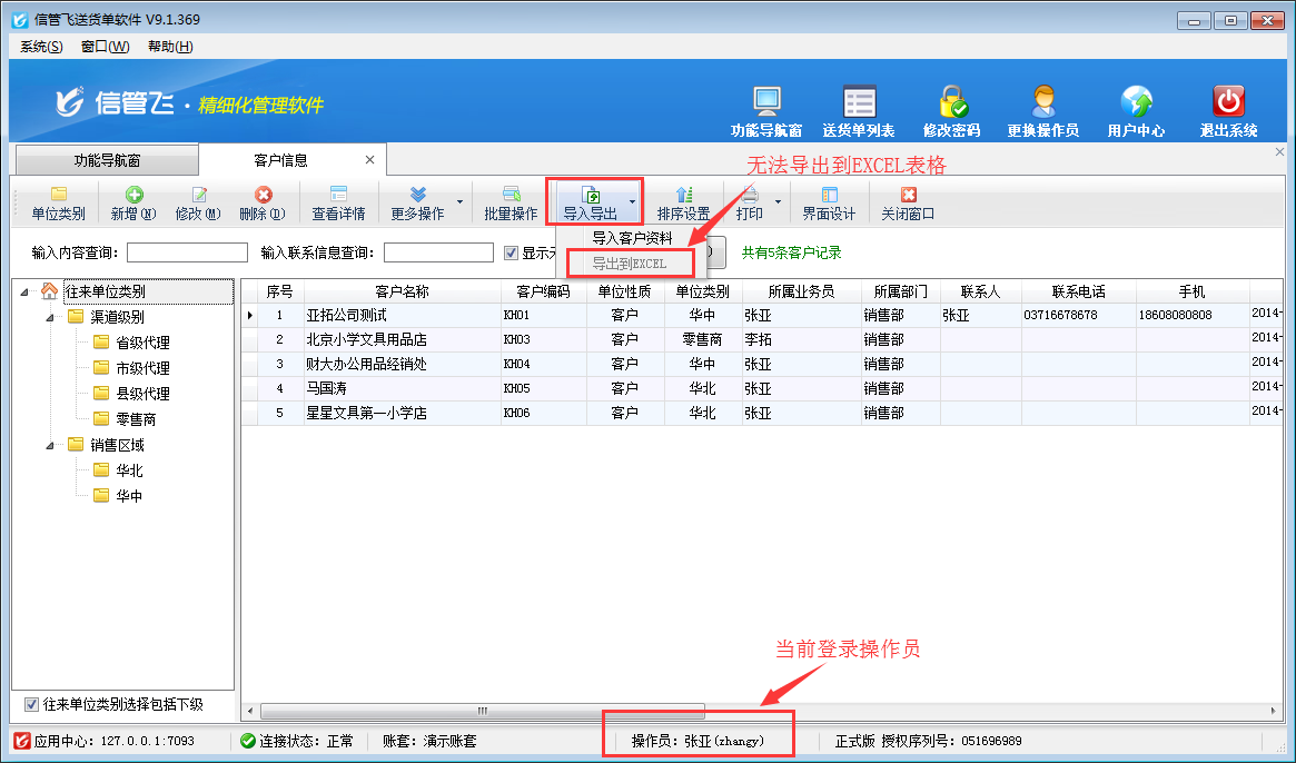 信管飛送貨單軟件、信管飛RMS、信管飛倉庫管理軟件等都支持管理基礎資料信息和允許設置多個操作員進行登錄軟件。軟件支持將基礎資料信息以EXCEL的形式導出放到自定義的文件夾內以供備份或保存,如果需要設置操作員不允許導出客戶信息,如何設置?本文以信管飛送貨單軟件為例,示范下如何設置操作員不可導出客戶信息。    在功能導航窗點擊“系統