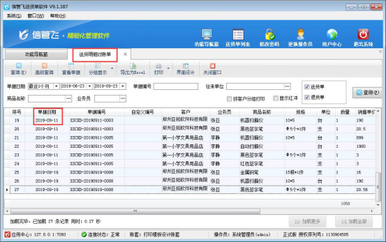 信管飛送貨單軟件支持開送貨單以及支持對已開單據明細匯總在送貨明細對賬單重,方便對賬。有時候需要把明細對賬單導出發給對應的客戶進行對賬。軟件送貨明細對賬單默認日期格式是顯示時間的,為了導出Excel文件更簡潔明了,軟件可設置送貨明細對賬單表的日期格式不顯示時間,只顯示出單據日期。     功能導航窗選擇“業務處
