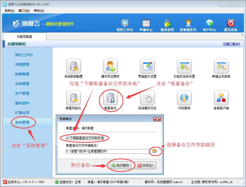 信管飛倉庫管理軟件、信管飛出納記賬軟件、信管飛送貨單軟件、信管飛RMS等軟件賬套數據默認存儲在軟件安裝目錄下,支持對賬套數據進行備份,如需要更換主機電腦,需要在原來的主機電腦上備份賬套數據,將生成的備份文件復制到新的主機電腦上,然后在新的主機電腦上安裝軟件,使用備份文件還原數據即可。    以信管飛倉庫管理軟件為例,演示一下更換電