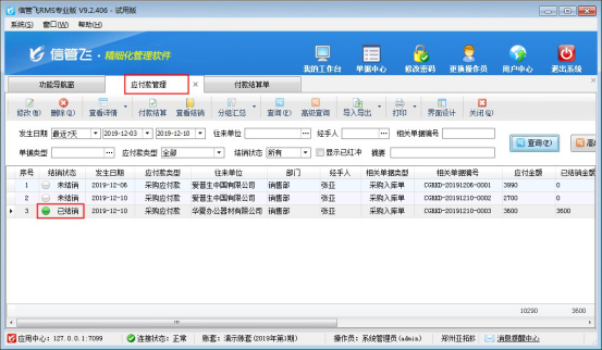 付款結(jié)算單可登記付款信息(付款對(duì)象即供應(yīng)商、付款賬戶、付款金額、經(jīng)手人等),并結(jié)銷應(yīng)付款記錄。本篇文章以信管飛RMS軟件為例演示一下對(duì)應(yīng)付款進(jìn)行付款結(jié)算的操作步驟。     信管飛RMS軟件的應(yīng)付款記錄是根據(jù)開的采購入庫單保存審核后自動(dòng)生成的,是一一對(duì)應(yīng)的。在功能導(dǎo)航窗點(diǎn)擊“往來管理”—》“應(yīng)付款管理”可查看