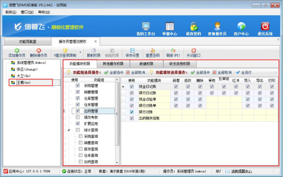 信管飛RMS軟件、信管飛倉庫管理軟件、信管飛出納記賬軟件、信管飛送貨單軟件等都支持設置多個操作員登錄軟件,本文以信管飛RMS軟件標準版為例演示一下如何新增操作員賬號并設置操作員權限?     操作員及授權實現對操作員的管理和權限分配。權限分為功能模塊權限、其他操作權限、數據權限等。另外部分權限(如資金賬戶權限