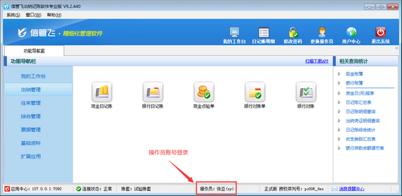 信管飛出納記賬軟件包括期末結賬的功能,當本期(即本月)的業務已審核處理完畢,就可以進行期末結賬處理。結賬后自動進入下一個賬期(月份),12月份結賬后將進入下一個年度。結賬后如果發現單據錯誤或賬簿數據有誤,可以進行反結賬處理。    另外,軟件支持操作員賬號及權限管理功能,支持設置多個操作員賬號可登錄軟件,本篇文章介紹一下如何設置操