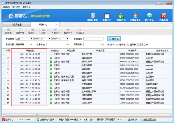 信管飛RMS是集采購管理、銷售管理、庫存管理、往來應(yīng)收應(yīng)付款等一體化的進(jìn)銷存管理軟件,軟件支持單據(jù)中心功能,在單據(jù)中心內(nèi)可以查詢到軟件內(nèi)所填開的所有業(yè)務(wù)單據(jù),可以根據(jù)單據(jù)日期、單據(jù)編號、單據(jù)類別、往來單位、商品名稱、審核狀態(tài)等信息查詢所需單據(jù),查詢結(jié)果默認(rèn)是根據(jù)單據(jù)日期正序顯示,如下圖所示。    如需設(shè)置單據(jù)中心按單據(jù)日期倒敘顯