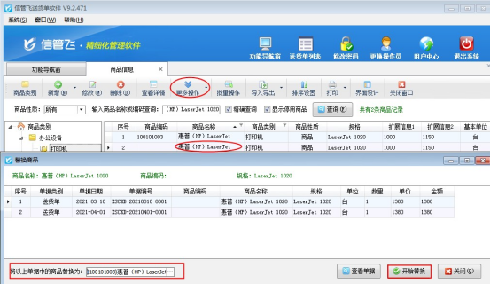 “替換商品(業(yè)務(wù)單據(jù))”顧名思義指可以把業(yè)務(wù)單據(jù)中的該商品批量替換為另外一個商品。軟件中替換商品功能一般作用于以下兩種情況:①開單選擇錯商品,可直接在商品信息中替換為正確的商品;②存在已開單重復(fù)的商品無法刪除。本文以第二種情況進(jìn)行示范。     信管飛送貨單軟件、信管飛RMS軟件都支持維護(hù)商品信息,軟件默認(rèn)刪