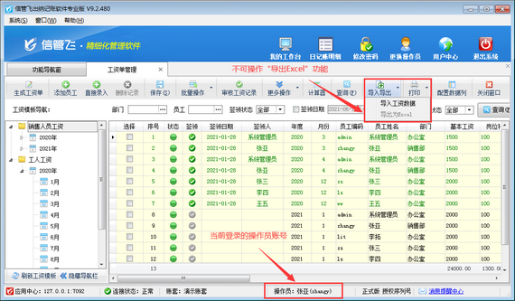 信管飛出納記賬軟件專業(yè)版包括工資管理功能,支持自定義工資模板管理員工工資單,可根據(jù)設(shè)置的工資模板快速生成工資單,支持從上月工資單復(fù)制工資項目數(shù)據(jù)。為了避免操作員導(dǎo)出工資單,軟件中可以設(shè)置操作員不可導(dǎo)出工資記錄權(quán)限。下邊我們在軟件中示范下設(shè)置操作員不可導(dǎo)出工資記錄權(quán)限的操作步驟。    登錄軟件,在功能導(dǎo)航窗點擊“系統(tǒng)管理”—》“操