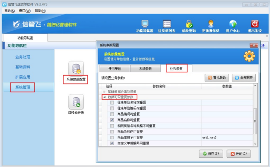 信管飛軟件系列產品都支持靈活針對使用情況,對軟件進行參數配置,對于基礎信息的操作,可設置是否重復參數,進行管理商品、客戶信息。本文針對“業務參數”中的數據可重復參數,介紹下如何使用。 在功能導航窗點擊“系統管理”—》“系統參數配置”點擊“業務參數”,啟用全部折疊,找到“數據可重復參數”,可以看到可重復