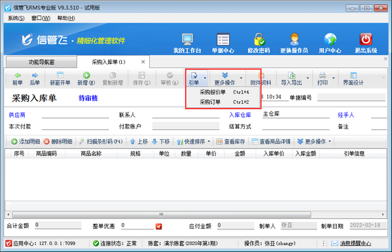 信管飛RMS(進銷存管理軟件)支持根據銷售訂單進行采購入庫進貨(如下圖所示),同時也支持配置操作員采購入庫單引用銷售訂單開單權限,本篇文章介紹一下進銷存管理軟件內如何設置操作員開采購入庫單不可引用銷售訂單?    在功能導航窗點“系統管理”—》“操作員及授權”即可進入“操作員管理及授權”界面,選中操作員賬號,在“其他操作權限”界面